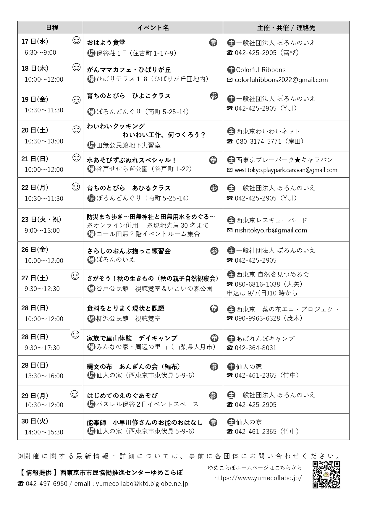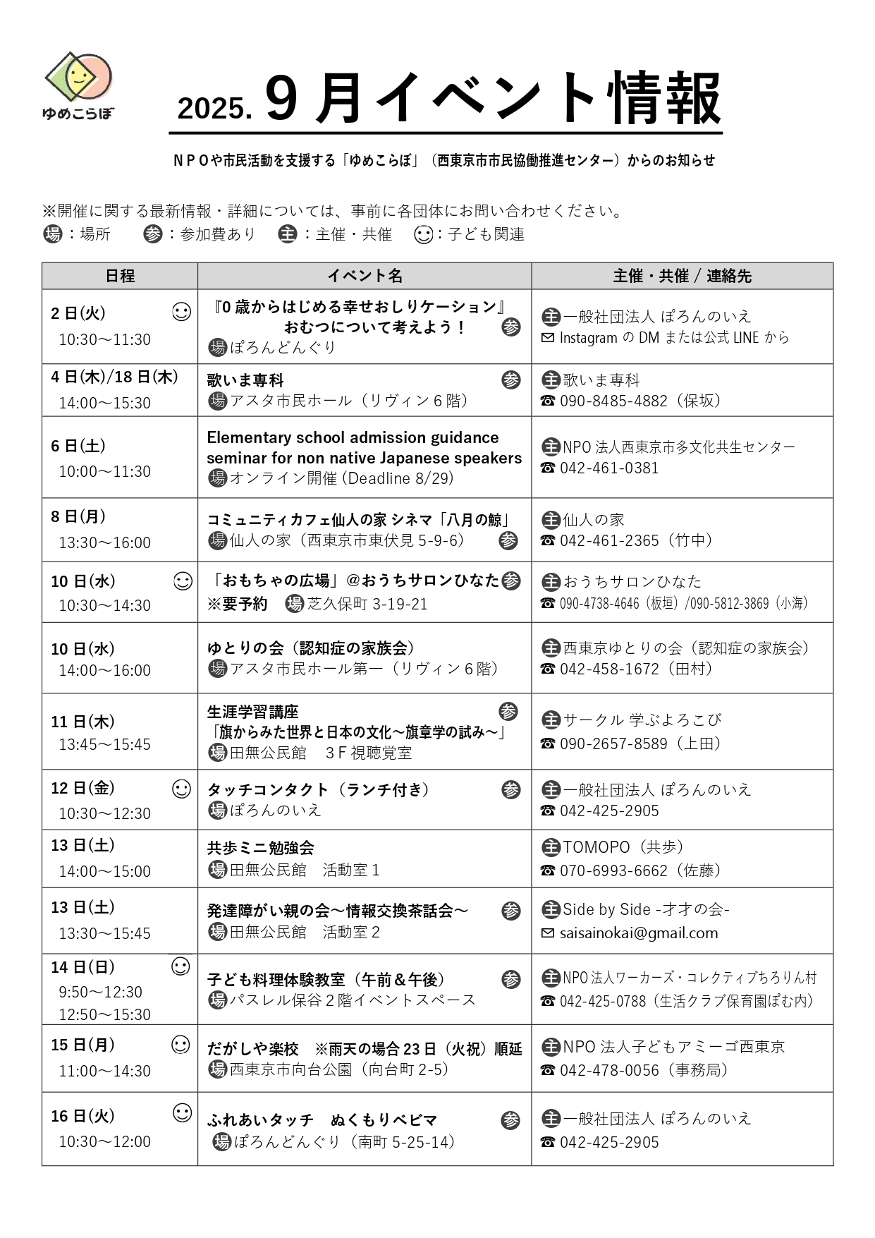 2025年8月30日 / 最終更新日時 : 2025年9月30日 yumecollabo イベント 2025年09月 イベント情報 2025年8月 < 2025年9月 > 2025年10月 PDFデータをダウンロード ▶ 2025年9月のイベント情報 [PDF:1.5Mb] ※画像をクリックすると拡大できます。