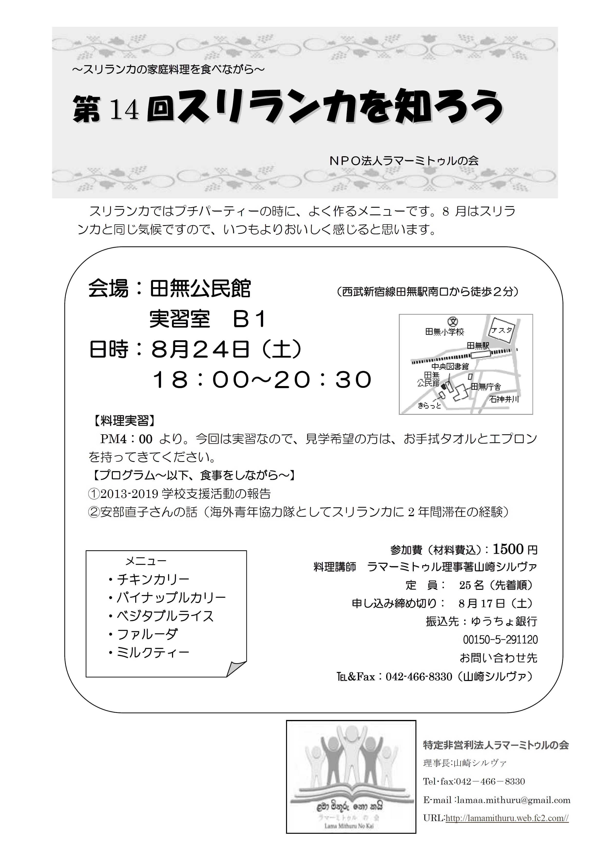 2019年7月9日 / 最終更新日時 : 2019年7月25日 yumecollabo 子ども 第14回スリランカを知ろう 開催日時 2019年08月24日(土曜日) 18:00〜20:30 会場 田無公民館 主催 NPO法人 ラマーミトゥルの会 連絡先 042-466-8330(山崎) 参加費 1500円 Facebook Facebook