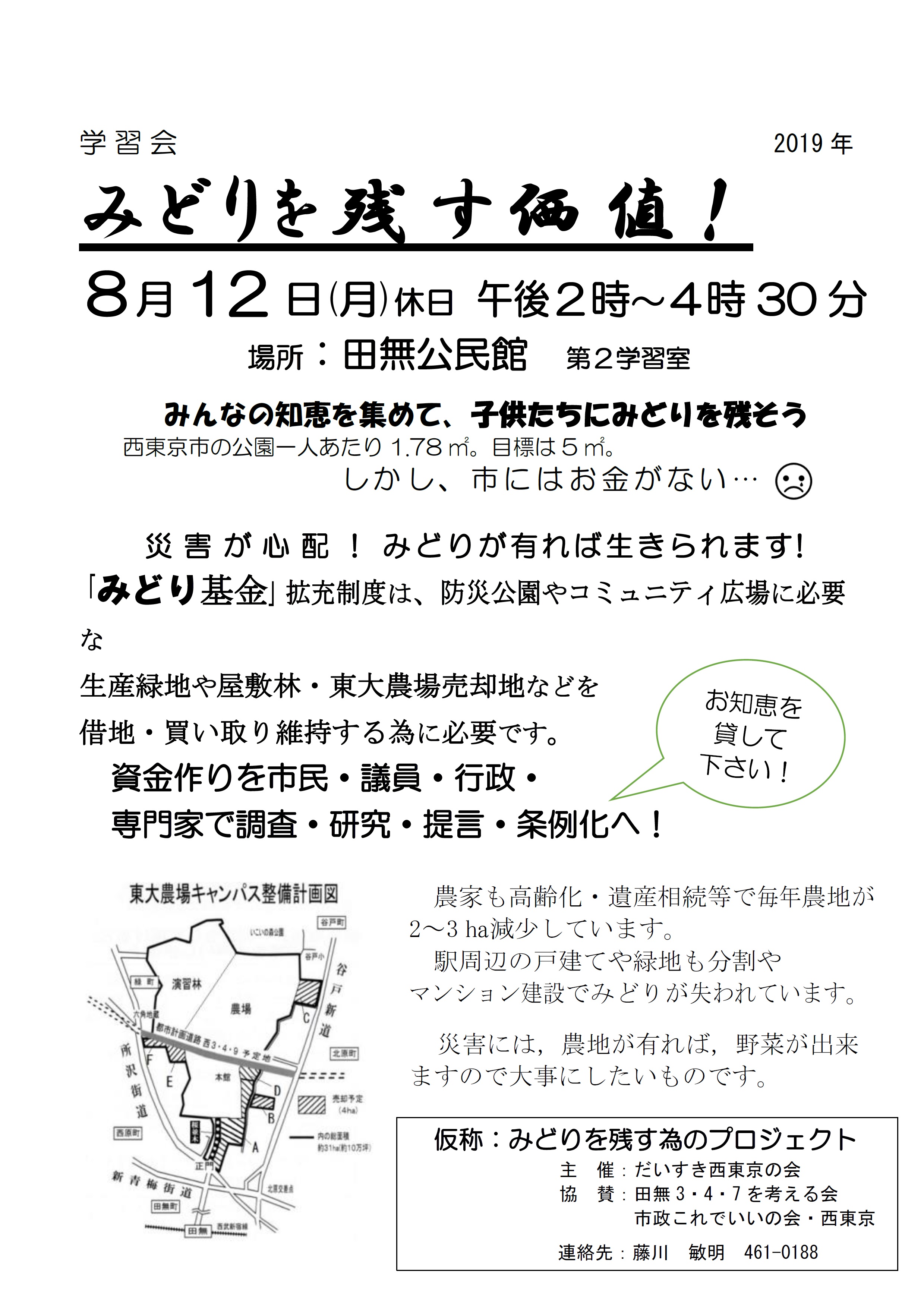 2019年8月3日 / 最終更新日時 : 2019年8月3日 yumecollabo 社会教育・まちづくり 学習会「みどりを残す価値」 開催日時 2019年08月12日(月曜日) 14:00〜16:30 会場 田無公民館 主催 東大農場・演習林を分断する都市計画道路 田無3・4・7を考える会 連絡先 042-461-0188 Facebook Facebook