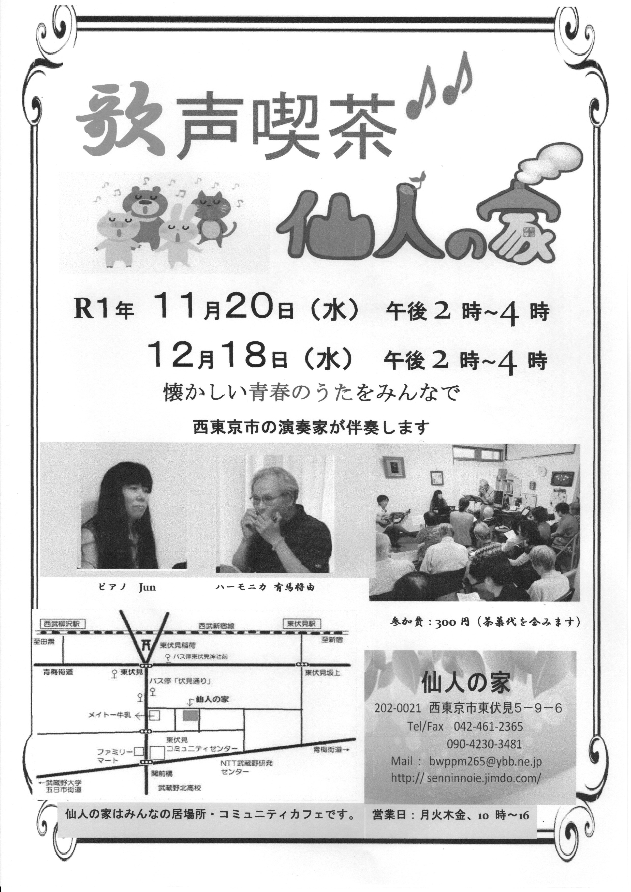 2019年11月4日 / 最終更新日時 : 2019年11月4日 yumecollabo 社会教育・まちづくり 歌声喫茶♪♪仙人の家 開催日時 2019年12月18日(水曜日) 14:00〜16:00 会場 仙人の家 連絡先 042-461-2365(竹中) 参加費 300円 Facebook