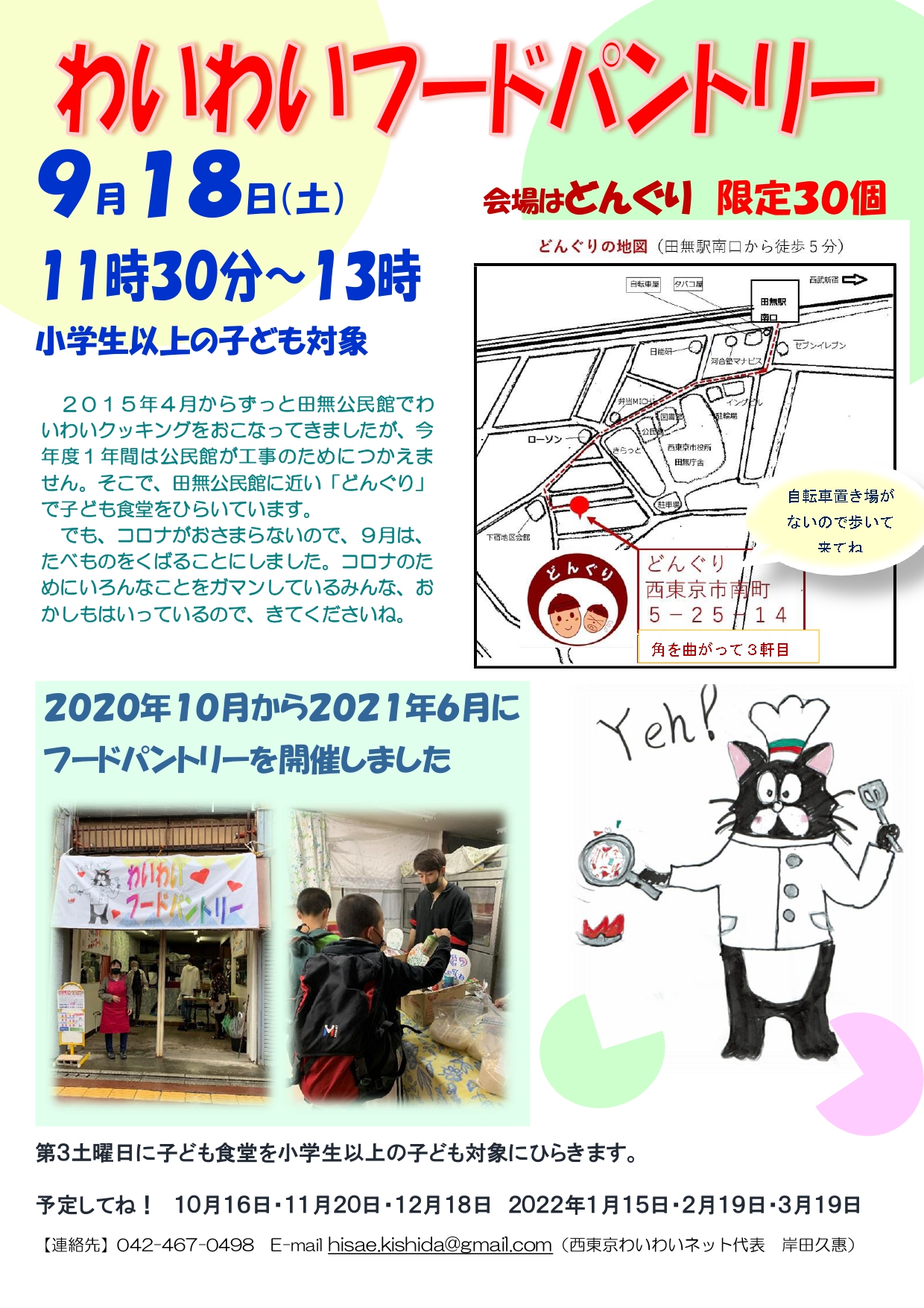 2021年8月31日 / 最終更新日時 : 2021年8月31日 yumecollabo 子ども わいわいフードパントリー 開催日時 2021年09月18日(土曜日) 11:30〜13:00 会場 どんぐり(南町5-25-14) 主催 西東京わいわいネット 連絡先 042-467-0498(岸田) Facebook
