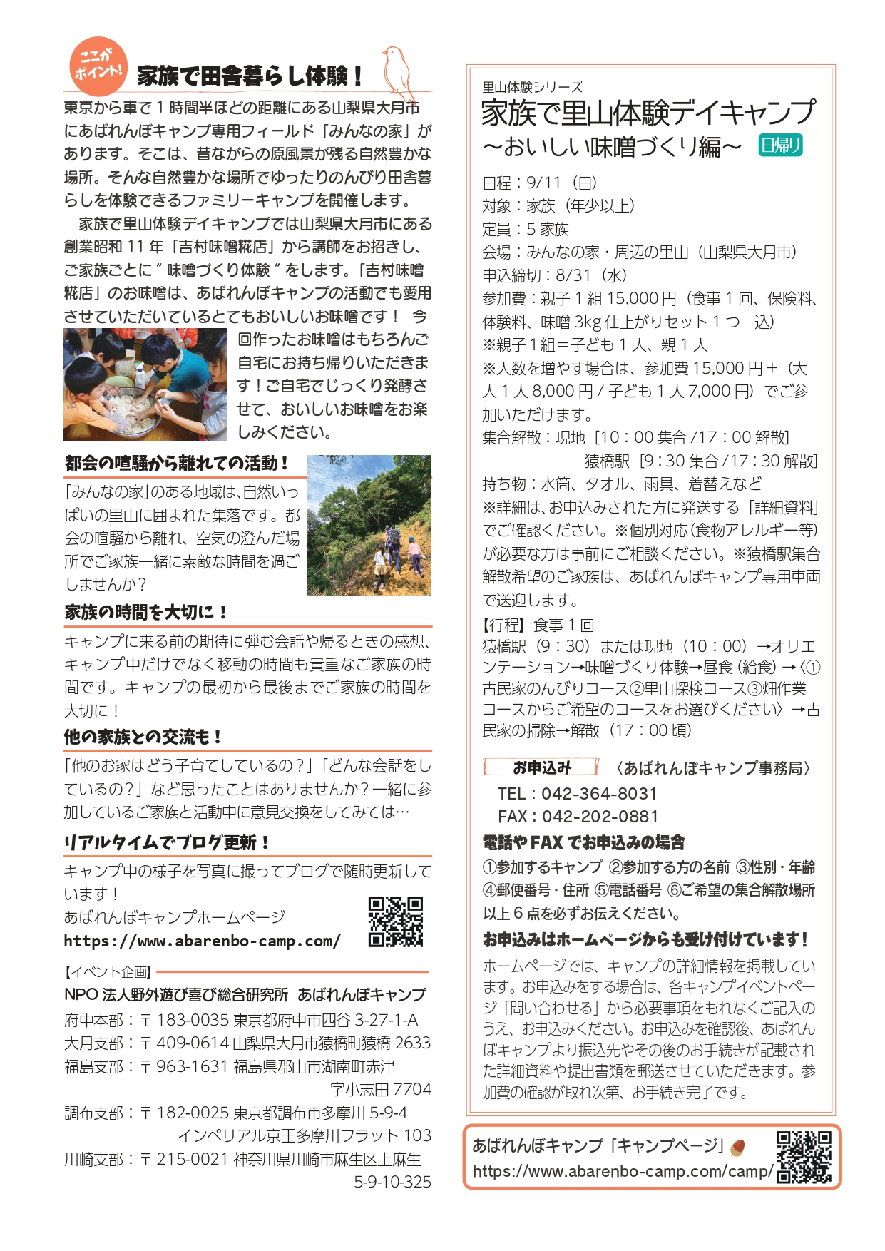 家族で里山体験デイキャンプ~おいしい味噌づくり編~(日帰り)
