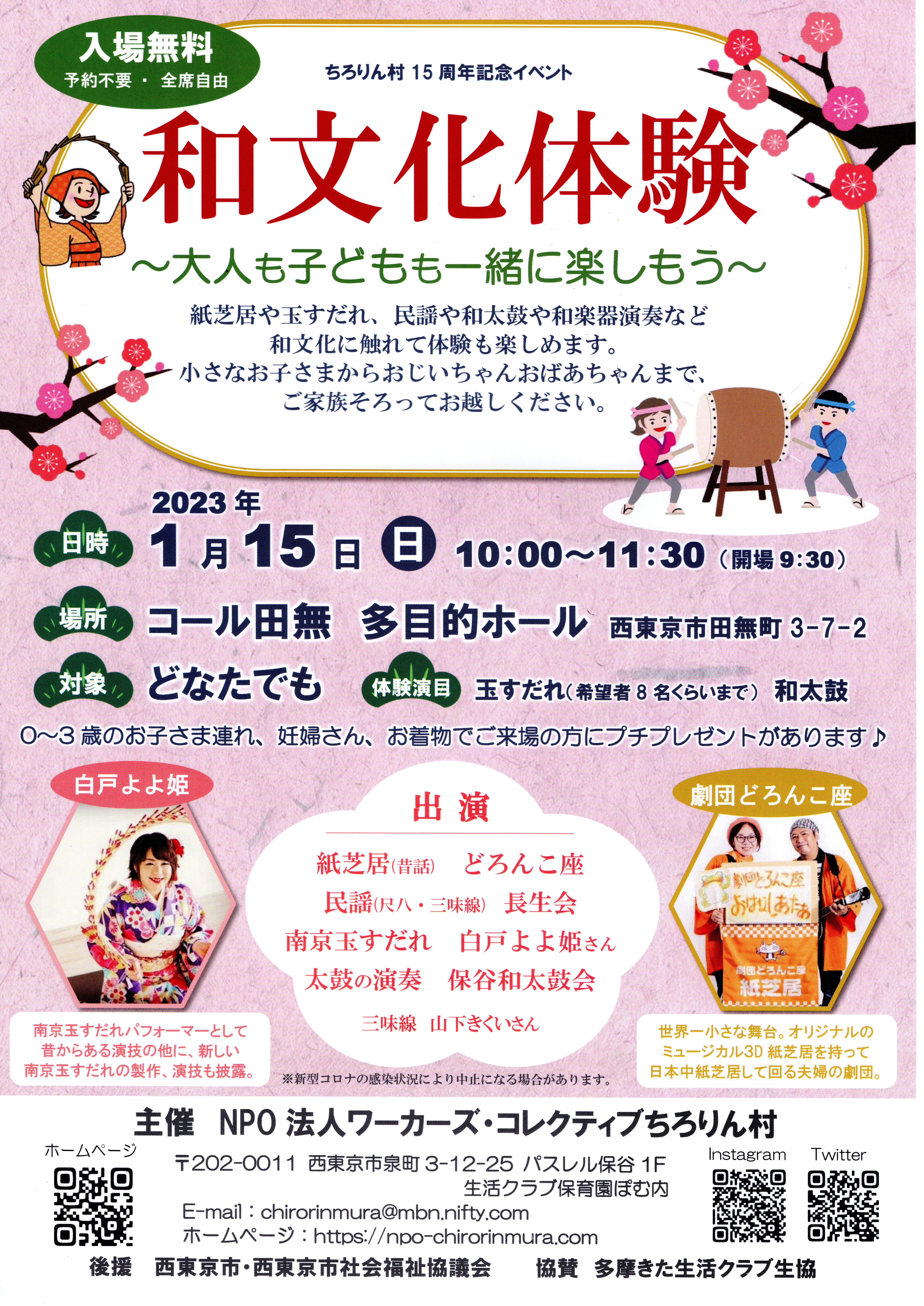 2022年12月15日 / 最終更新日時 : 2022年12月15日 yumecollabo 子ども ちろりん村15周年記念イベント 和文化体験 開催日時 2023年01月15日(日曜日) 10:00〜11:30 会場 コール田無 多目的ホール 主催 NPO法人 ワーカーズ・コレクティブちろりん村 連絡先 042-425-0788