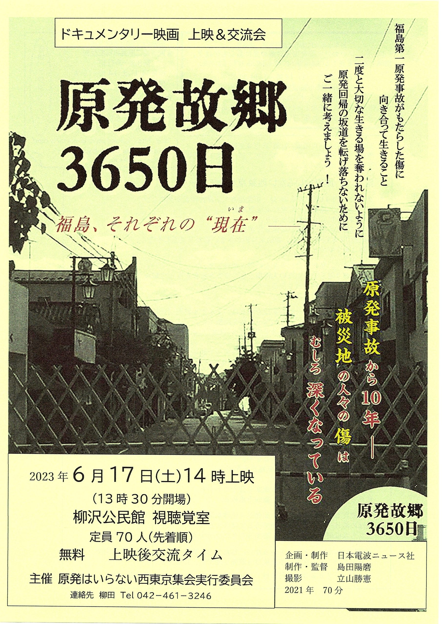 2023年5月30日 / 最終更新日時 : 2023年5月30日 yumecollabo 社会教育・まちづくり ドキュメンタリー映画上映&交流会 原発故郷3650日 開催日時 2023年06月17日(土曜日) 14:00〜終了未定 会場 柳沢公民館視聴覚室 主催 原発はいらない西東京集会実行委員会 連絡先 042-461-3246(柳田) Facebook Facebook