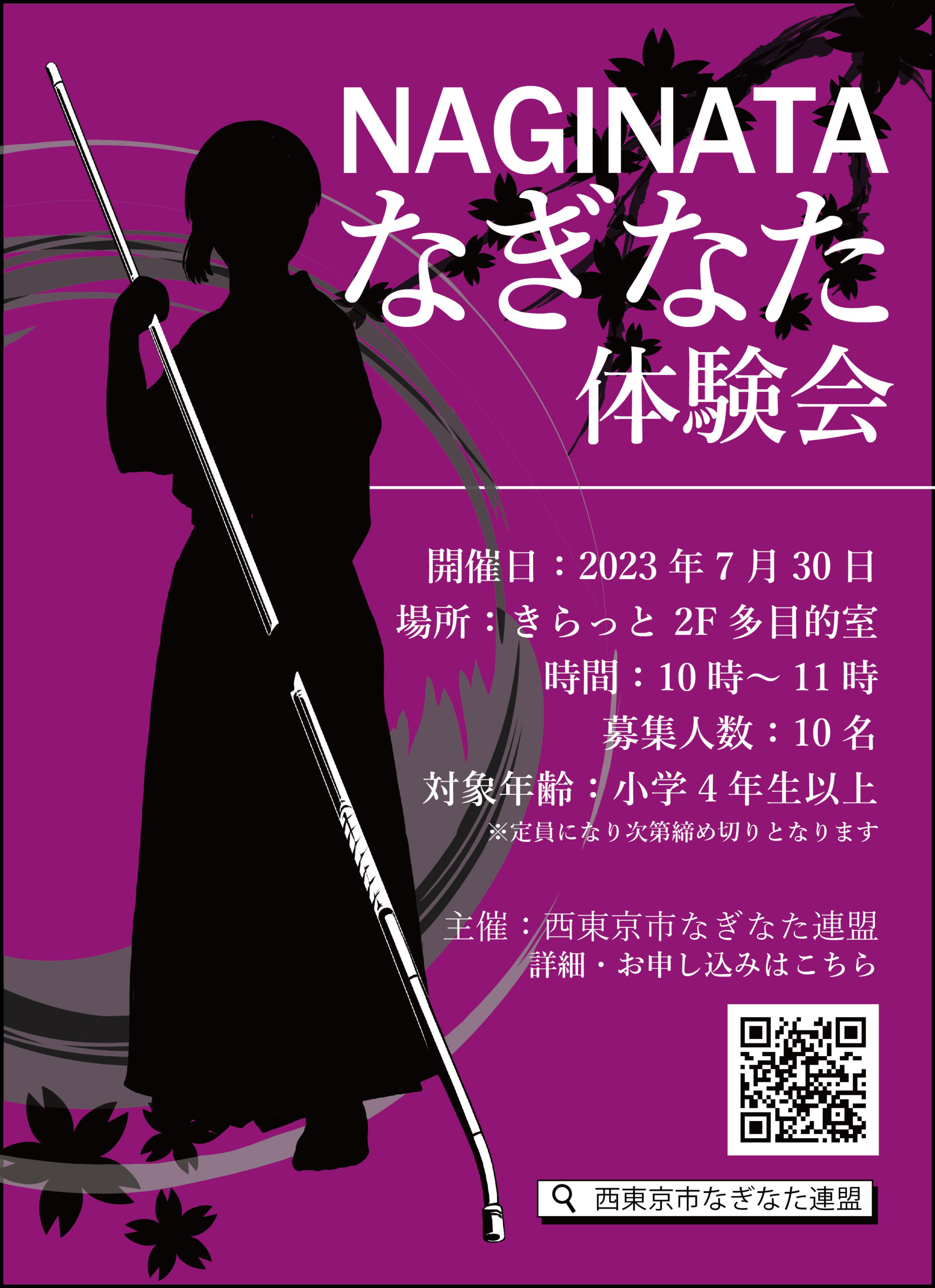 2023年6月29日 / 最終更新日時 : 2023年6月29日 yumecollabo なぎなた体験教室のご案内 開催日時 2023年07月30日(日曜日) 10:00〜11:00 会場 きらっと多目的ホール 主催 西東京市なぎなた連盟 参加費 200円(保険代) 西東京市なぎなた連盟 お問合せ