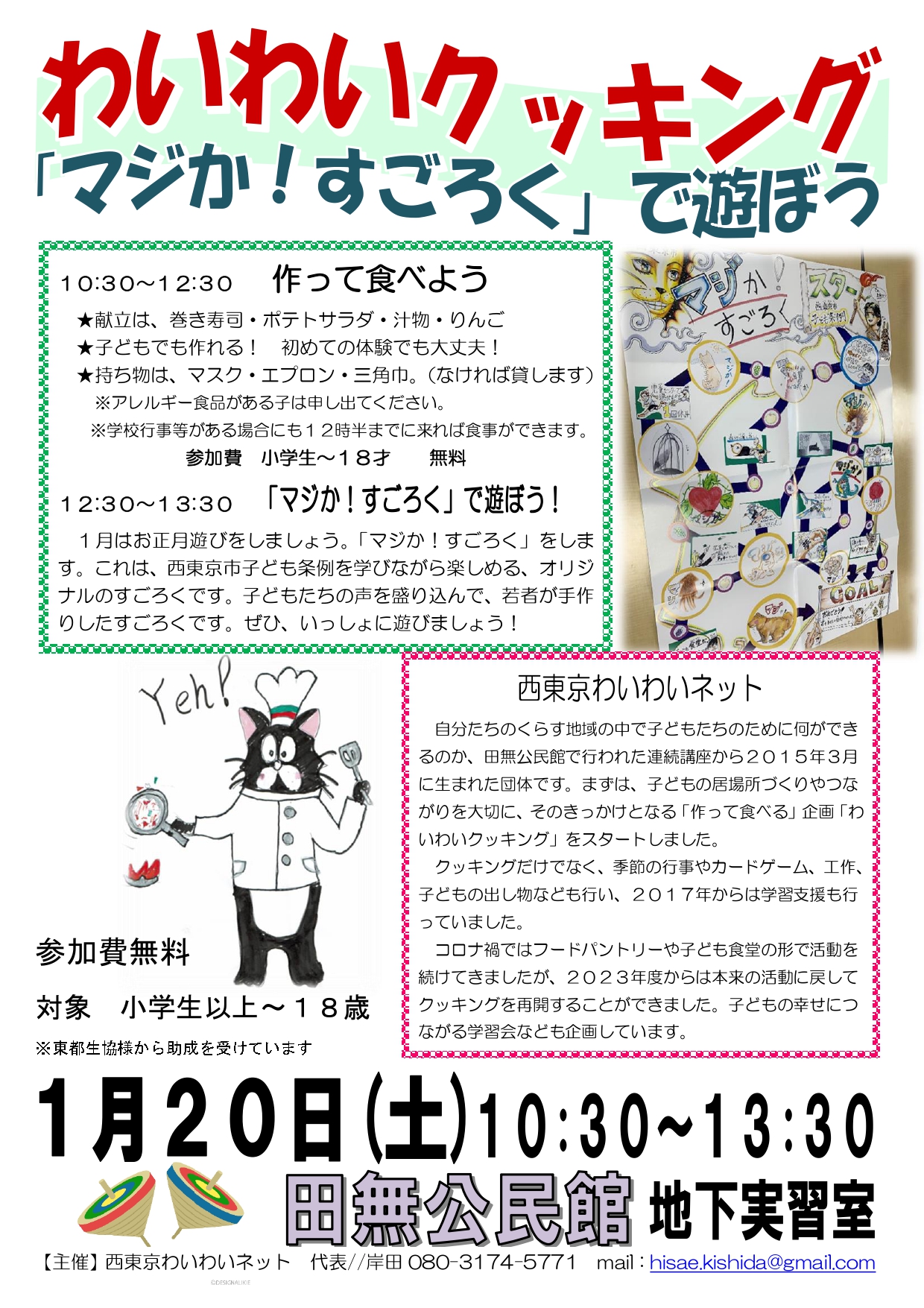 2023年10月7日 / 最終更新日時 : 2023年12月21日 yumecollabo 子ども わいわいクッキング&お楽しみ活動や勉強会 開催日時 2024年01月20日(土曜日) 10:30〜13:30 会場 田無公民館地下実習室 主催 西東京わいわいネット 連絡先 080-3174-5771(岸田) Facebook Facebook
