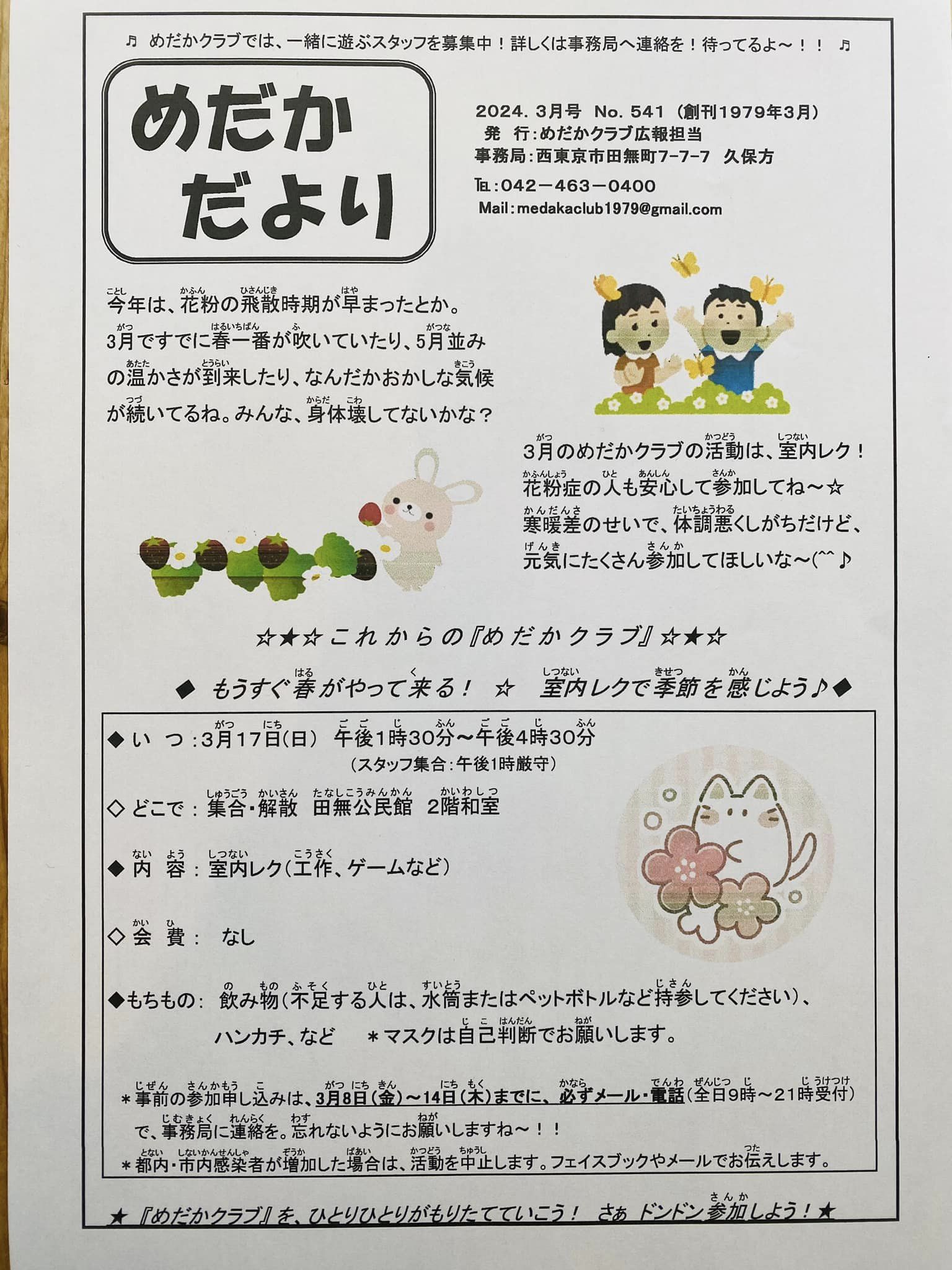 2024年3月6日 / 最終更新日時 : 2024年3月6日 yumecollabo 子ども めだかクラブ ♦もうすぐ春がやって来る!☆室内レクで季節を感じよう♪♦ 開催日時 2024年03月17日(日曜日) 13:30〜16:30 会場 田無公民館 2階 活動室和室 主催 めだかクラブ 連絡先 042-463-0400(久保) 参加費 無料 申込が必要です。 Facebook Facebook