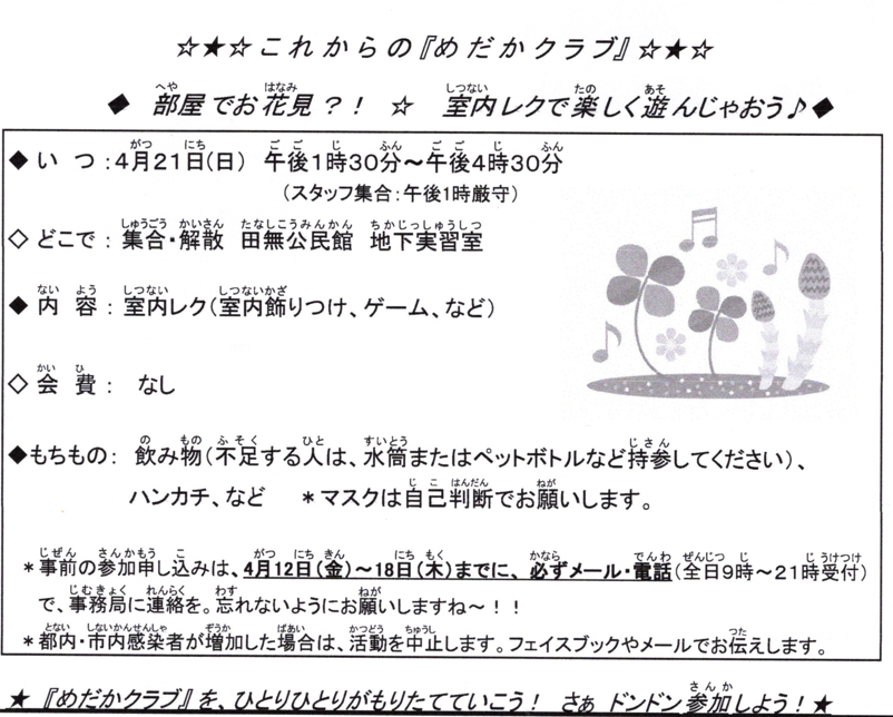 2024年4月15日 / 最終更新日時 : 2024年4月15日 yumecollabo 子ども めだかクラブ ♦お部屋でお花見?!☆室内レクで楽しく遊んじゃおう♪♦ 開催日時 2024年04月21日(日曜日) 13:30〜16:30 会場 田無公民館 地下実習室 主催 めだかクラブ 連絡先 042-463-0400(久保) 参加費 無料 申込が必要です。 Facebook Facebook