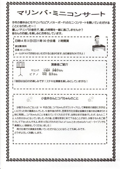 2016年9月19日 / 最終更新日時 : 2016年9月20日 yumecollabo 子どもの広場「マリンバ・ミニコンサート」 開催日時 2016年04月03日(日曜日) 14:00〜17:00 会場 小林宅(住所:東京都西東京市向台町1-11-5) 主催 非公開: 子どもの広場