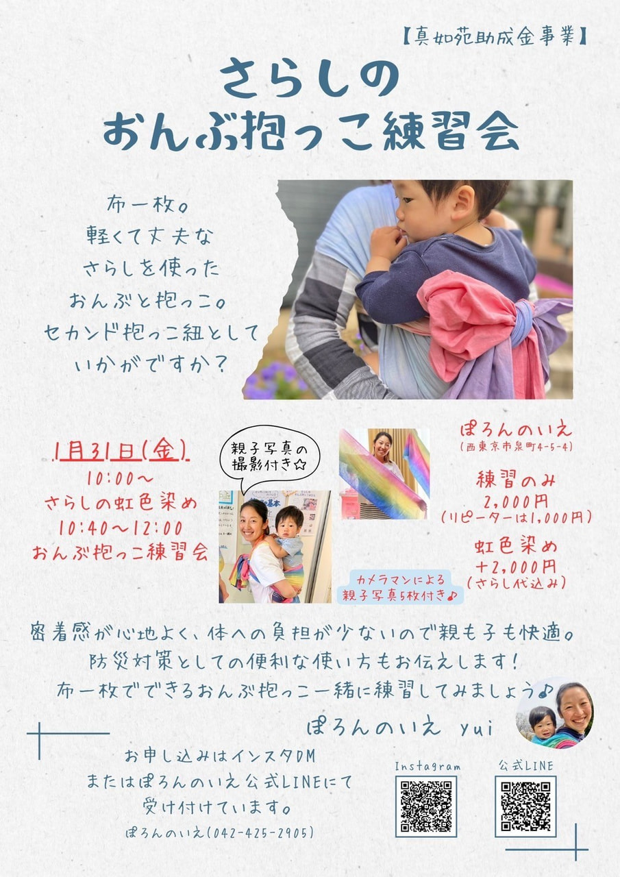 | 参加費 | 虹色染め&練習 4,000円(10:00~) 練習会のみ 2,000円(10:40~)リピーターは1,000円 ※さらし抱っこ紐1枚分の料金が含まれています。 さらしを持ち込みされる場合はお値引きいたします。 |