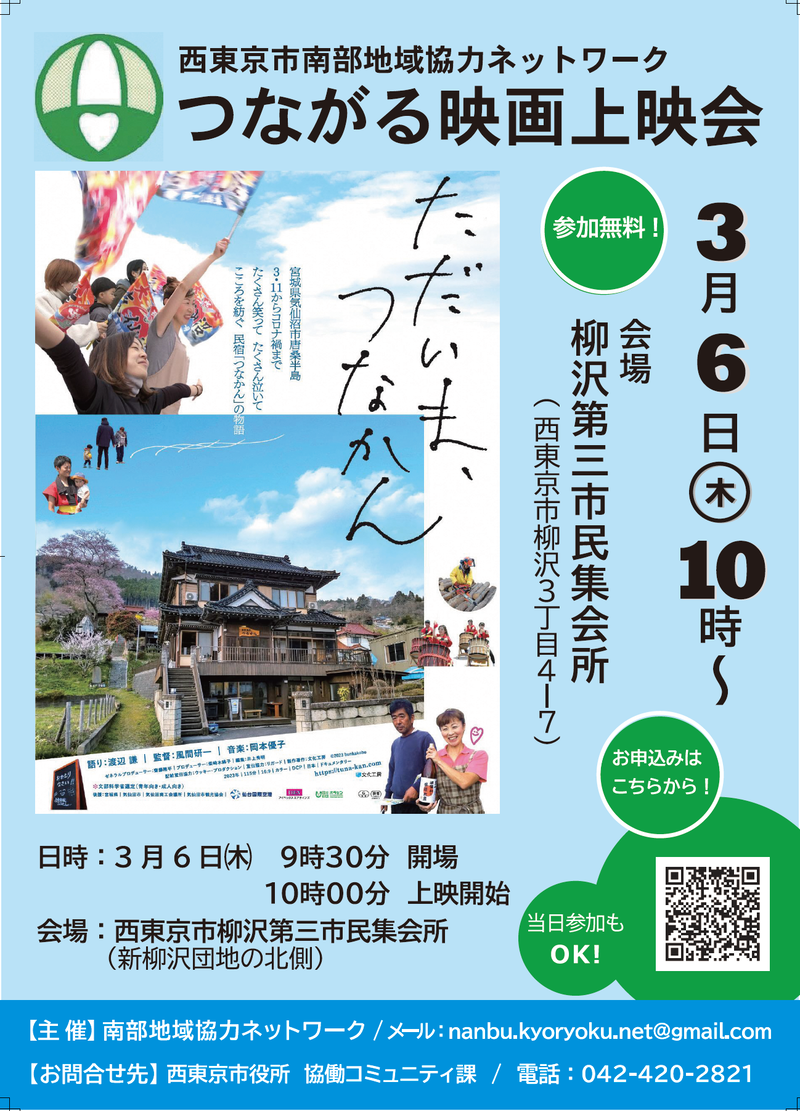 2025年2月7日 / 最終更新日時 : 2025年2月7日 yumecollabo 南部地域協力ネットワーク つながる映画上映会 開催日時 2025年03月06日(木曜日) 10:00〜終了未定 会場 西東京市柳沢第三市民集会所 主催 南部地域協力ネットワーク 連絡先 042-420-2821(西東京市協働コミュニティ課) Facebook