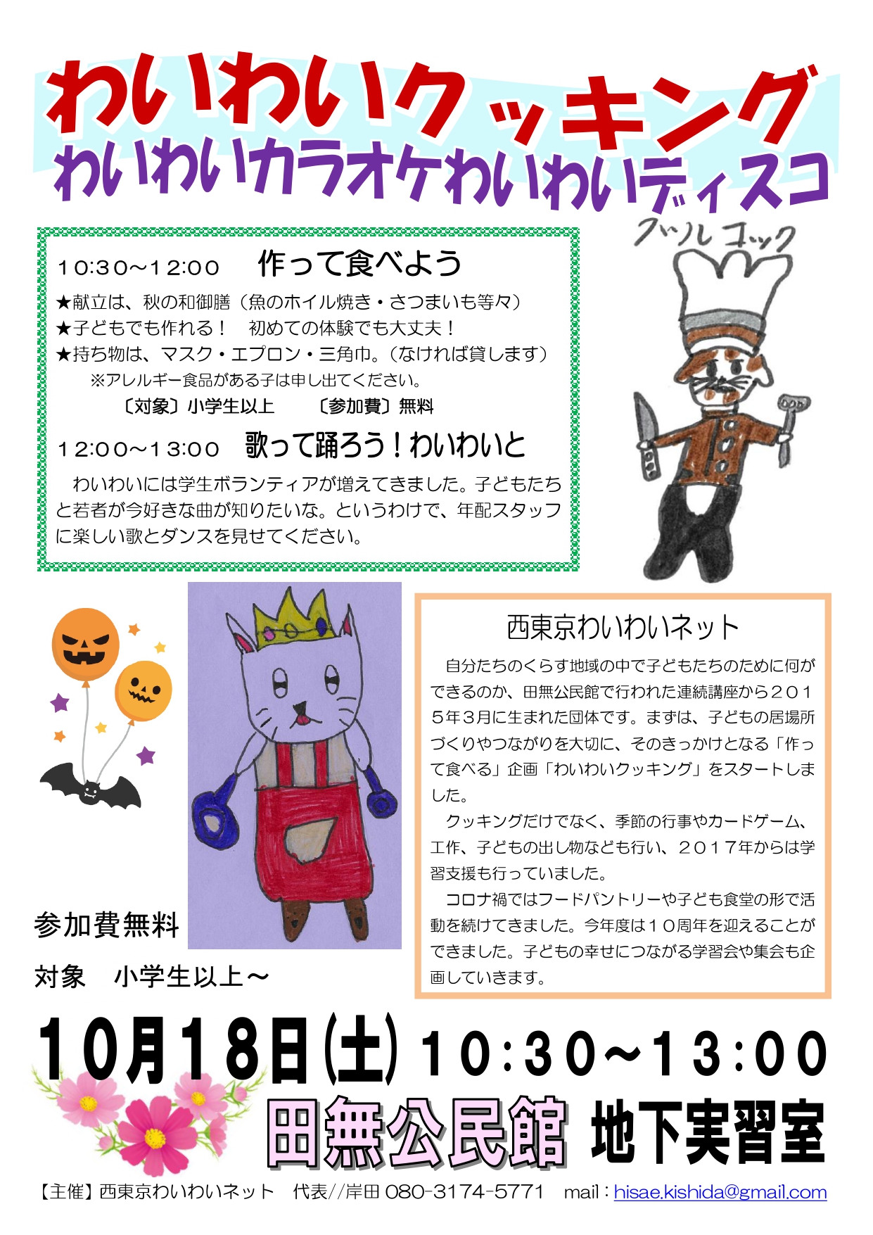 2025年3月22日 / 最終更新日時 : 2025年9月13日 yumecollabo 子ども わいわいクッキング&わいわいカラオケわいわいディスコ 開催日時 2025年10月18日(土曜日) 10:30〜13:00 会場 田無公民館地下実習室 主催 西東京わいわいネット 連絡先 080-3174-5771(岸田) 参加費 子ども無料