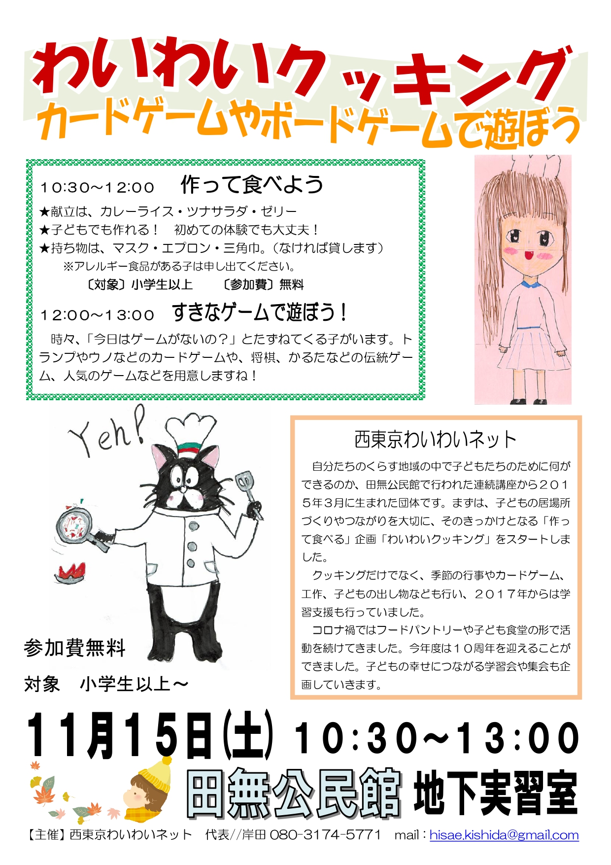 2025年3月22日 / 最終更新日時 : 2025年11月5日 yumecollabo 子ども わいわいクッキング&カードゲームやボードゲームで遊ぼう 開催日時 2025年11月15日(土曜日) 10:30〜13:00 会場 田無公民館地下実習室 主催 西東京わいわいネット 連絡先 080-3174-5771(岸田) 参加費 子ども無料