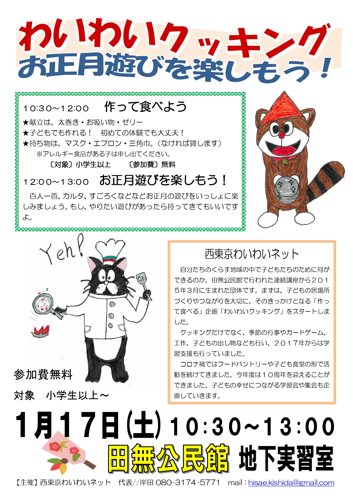 2025年3月22日 / 最終更新日時 : 2025年12月15日 yumecollabo 子ども わいわいクッキング&お正月遊びを楽しもう! 開催日時 2026年01月17日(土曜日) 10:30〜13:00 会場 田無公民館地下実習室 主催 西東京わいわいネット 連絡先 080-3174-5771(岸田) 参加費 子ども無料