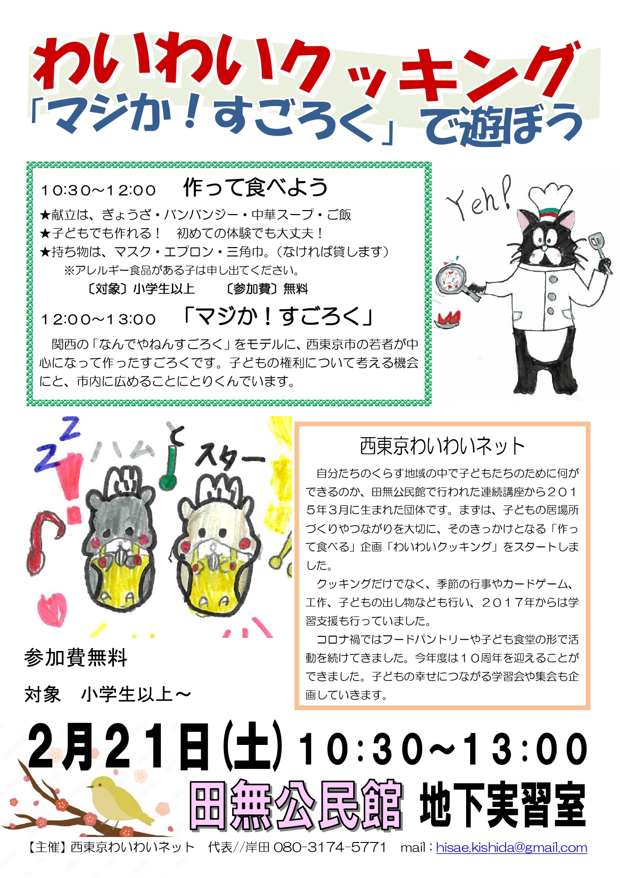 2025年3月22日 / 最終更新日時 : 2026年1月17日 yumecollabo 子ども わいわいクッキング 「マジか!すごろく」で遊ぼう 開催日時 2026年02月21日(土曜日) 10:30〜13:00 会場 田無公民館地下実習室 主催 西東京わいわいネット 連絡先 080-3174-5771(岸田) 参加費 子ども無料