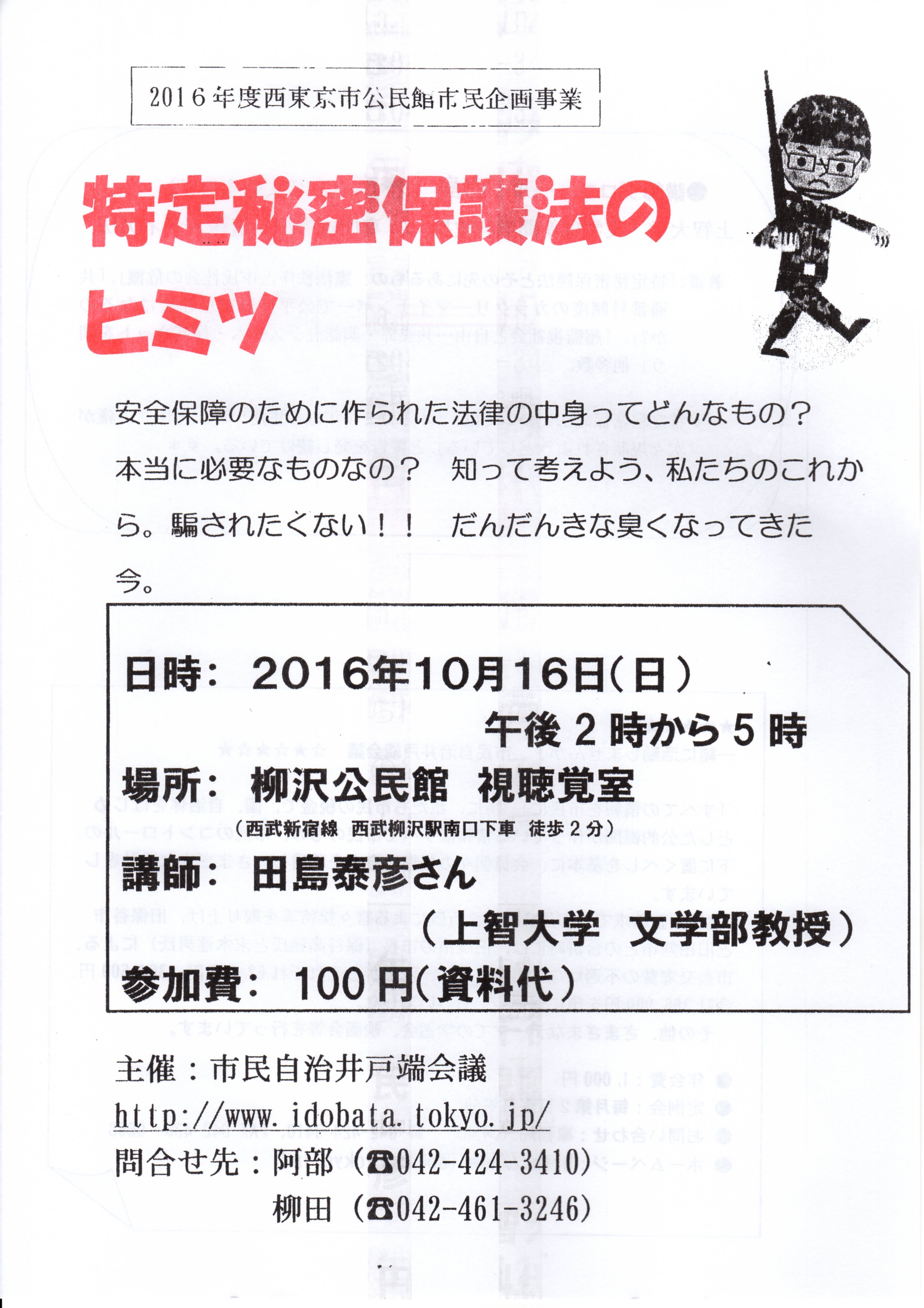 2016年10月4日 / 最終更新日時 : 2016年10月4日 yumecollabo 特定秘密保護法のヒミツ 開催日時 2016年10月16日(日曜日) 14:00〜17:00 会場 柳沢公民館 主催 市民自治井戸端会議 連絡先 042-424-3410 Facebook
