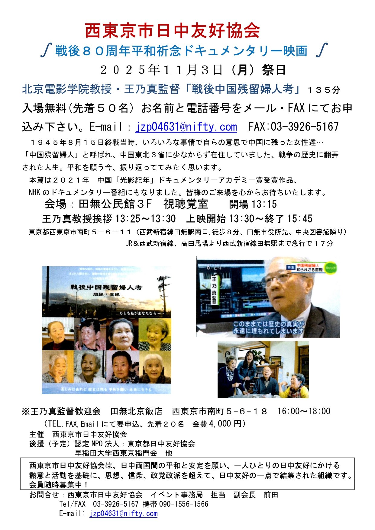 | 参加費 | 上映会は無料、MailとFaxで要申込 監督歓迎会は会費4,000円(Tel、Fax、Mailにて要申込) |