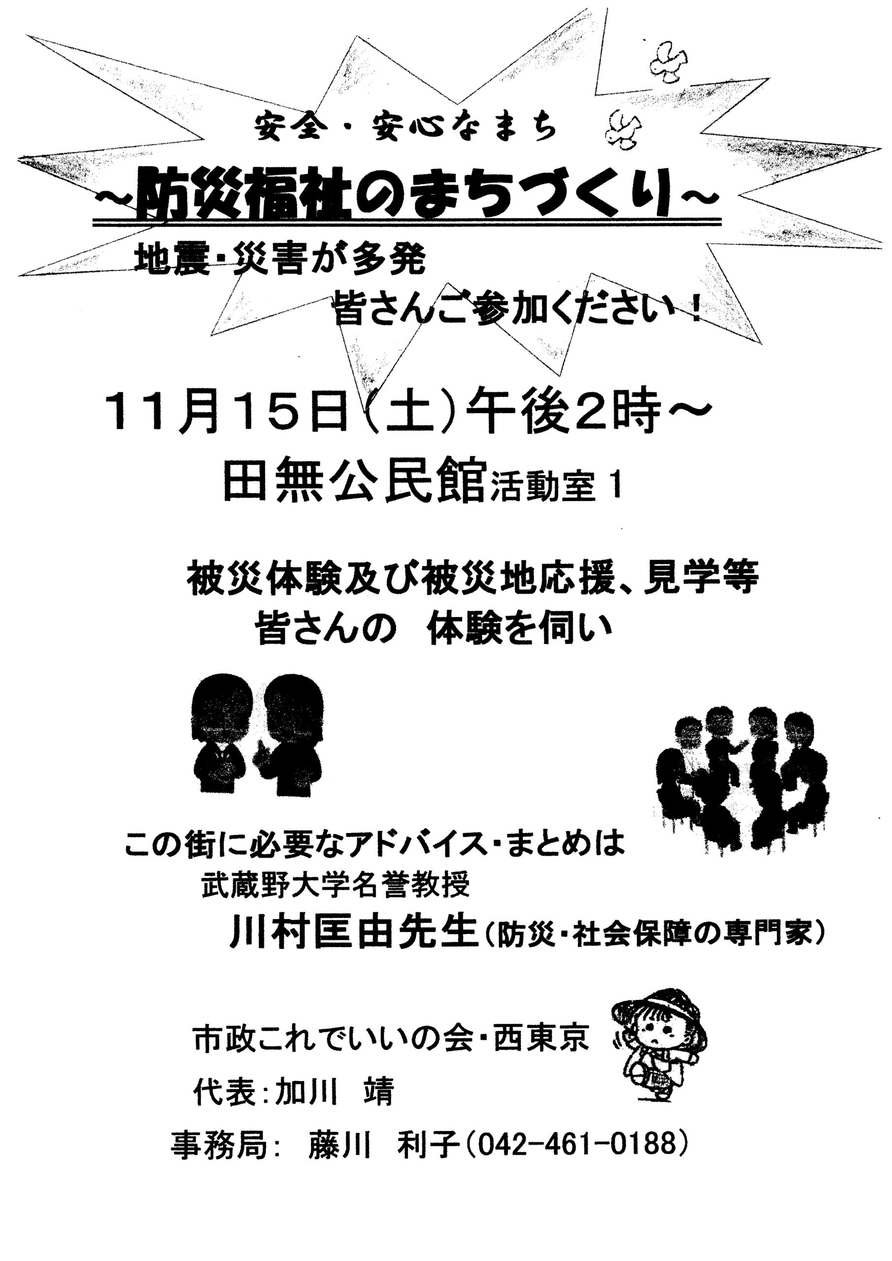 2025年10月21日 / 最終更新日時 : 2025年10月21日 yumecollabo 社会教育・まちづくり 防災福祉のまちづくり 開催日時 2025年11月15日(土曜日) 14:00〜終了未定 会場 田無公民館 活動室1 主催 市政これでいいの会・西東京 連絡先 事務局:藤川利子 042-461-0188