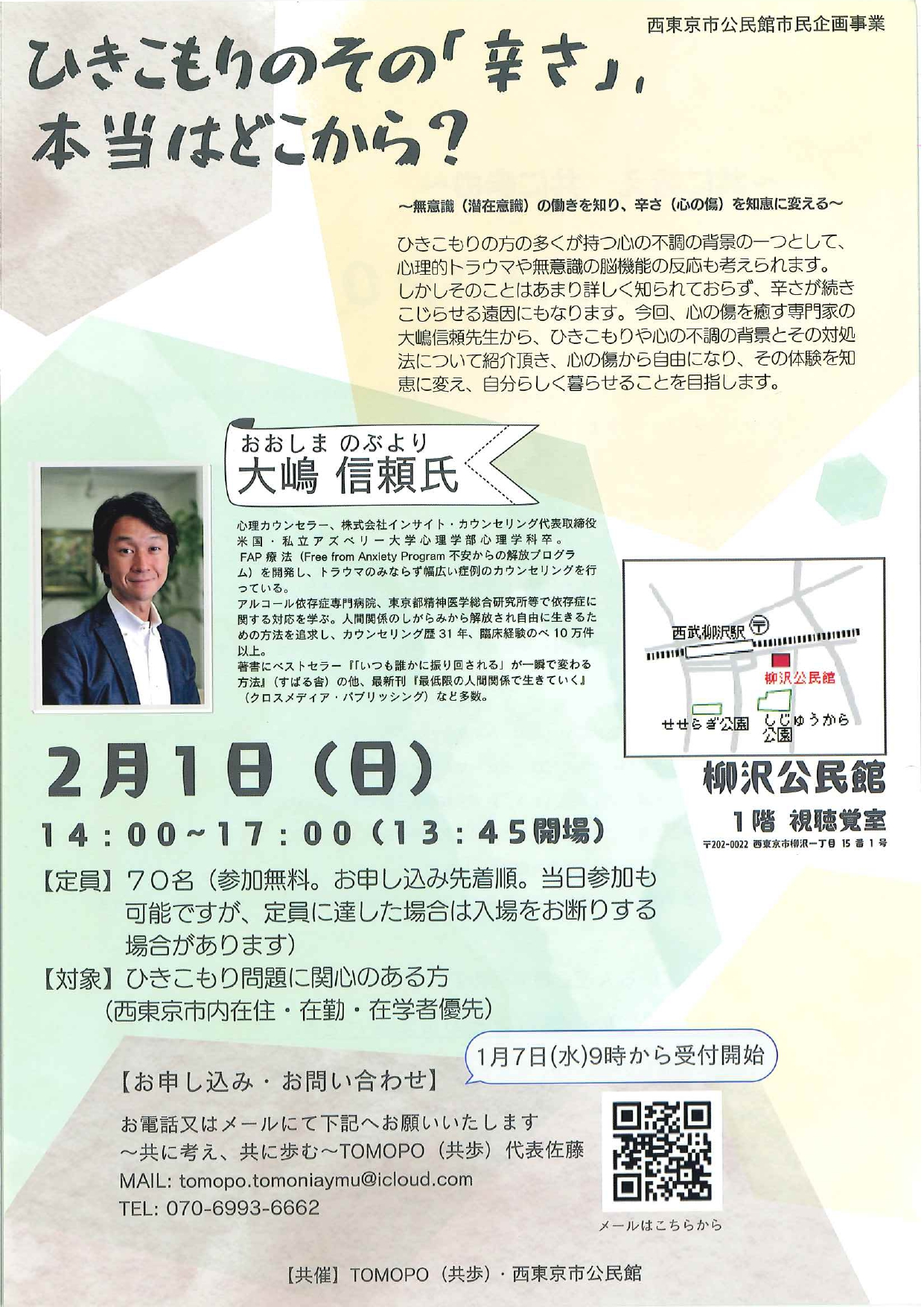 | 参加費 | 無料、電話かメールで申込先着70名 ※1/7(水)9:00から受付開始! |