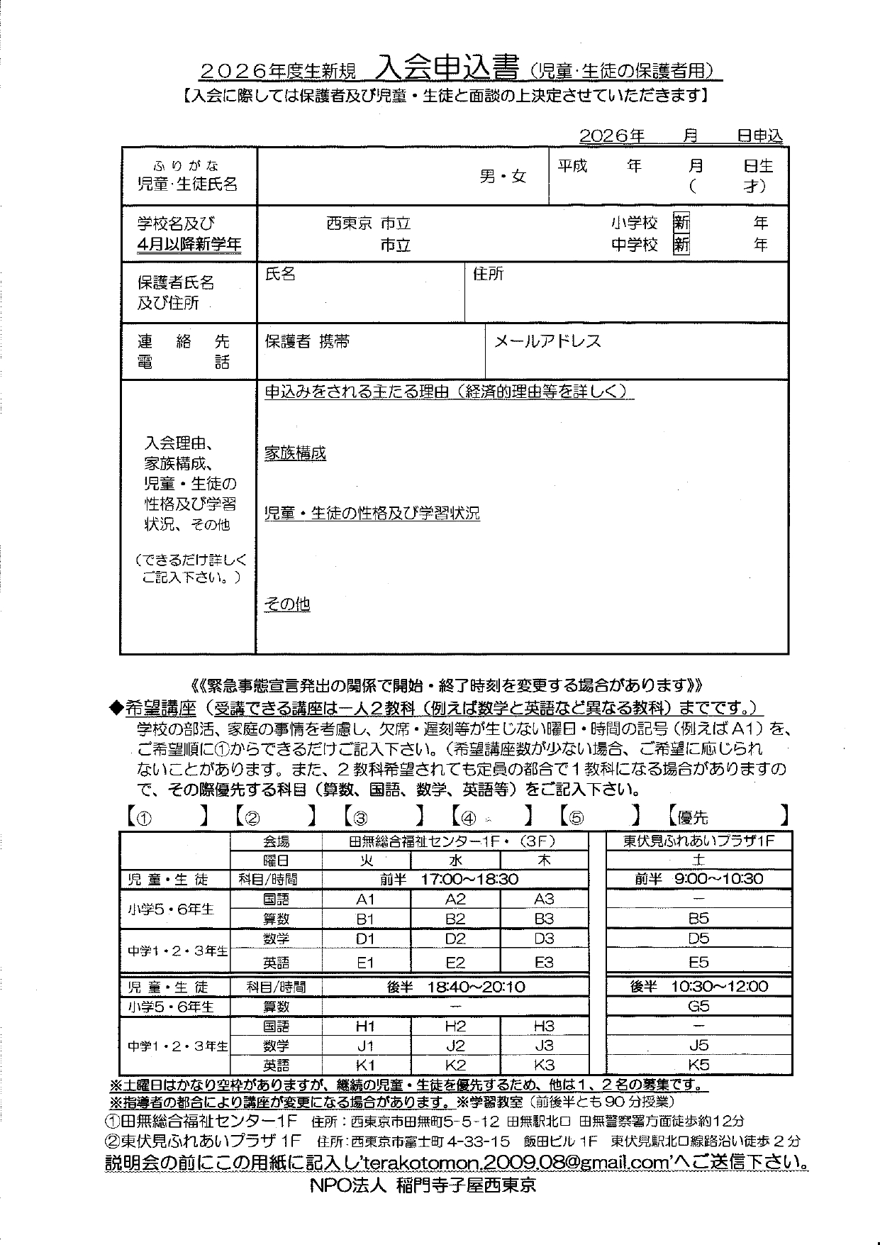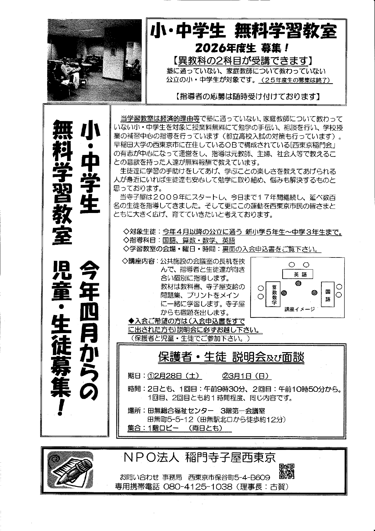 稲門寺子屋西東京「小・中学生 無料学習教室 保護者・生徒 説明会及び面談」①