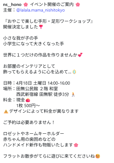 | 連絡先 | 問合せ、申込は ラララ♪MaMaの菊田までInstagramのDMから! |