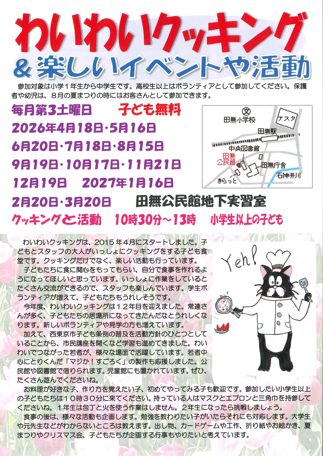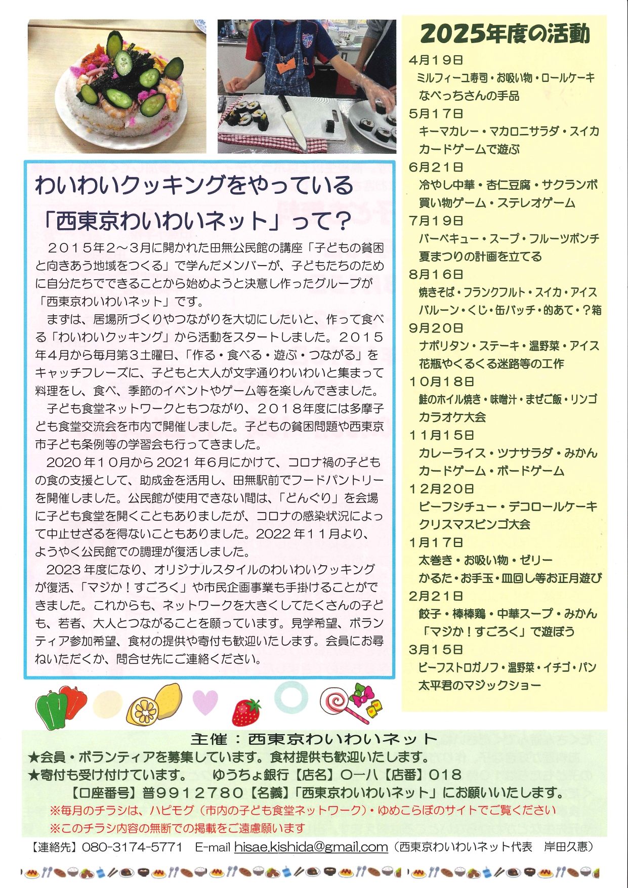 2026年4月4日 / 最終更新日時 : 2026年4月4日 yumecollabo 子ども わいわいクッキング&たのしいイベント! 開催日時 2027年03月20日(土曜日) 10:30〜13:00 会場 田無公民館地下実習室 主催 西東京わいわいネット 連絡先 080-3174-5771(岸田) 参加費 子ども無料 Facebook Facebook
