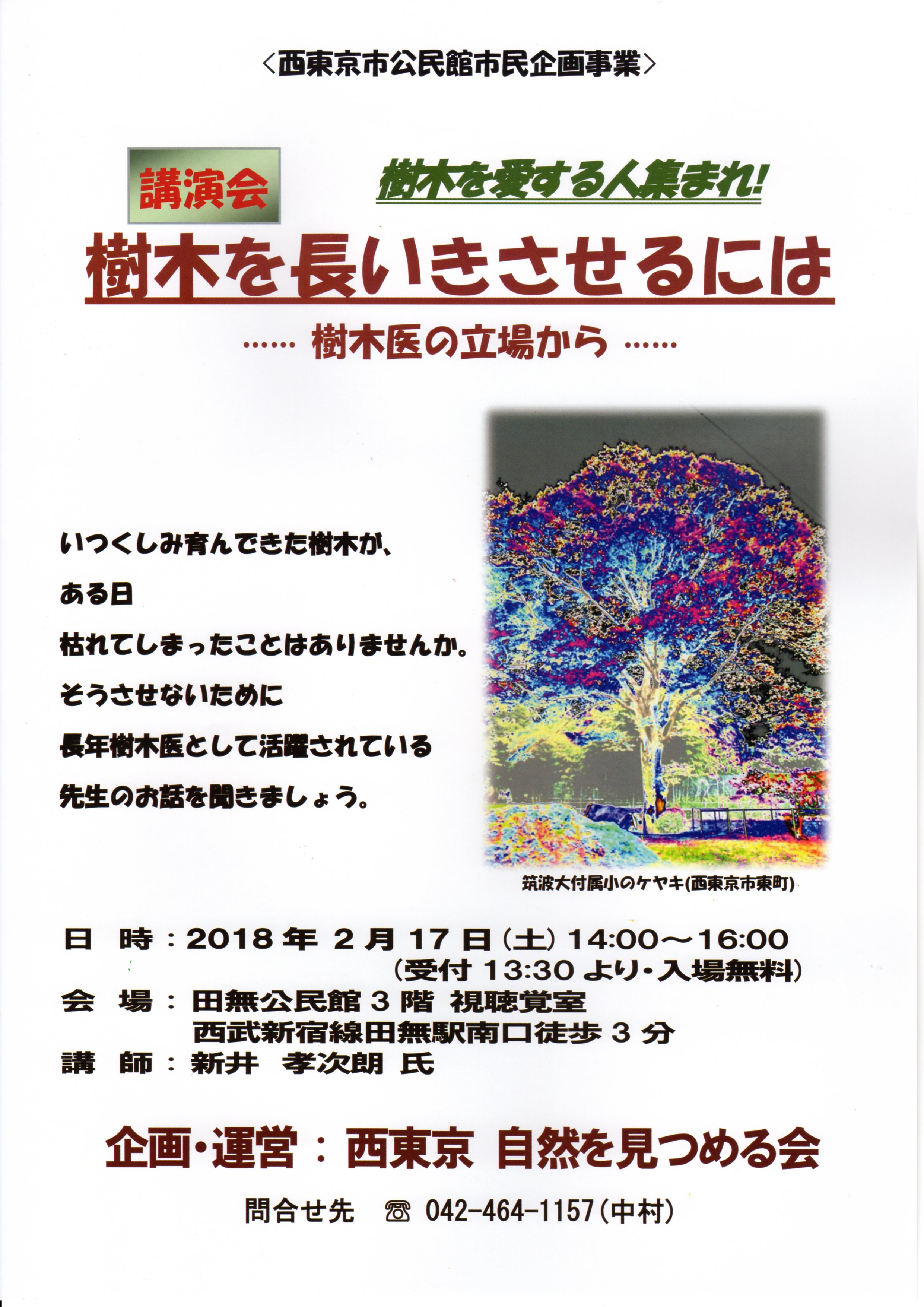 2017年12月6日 / 最終更新日時 : 2017年12月20日 yumecollabo 樹木を長生きさせるには~樹木医の立場から~ 開催日時 2018年02月17日(土曜日) 14:00〜16:00 会場 田無公民館 主催 西東京 自然を見つめる会 連絡先 080-6816-1038 Facebook