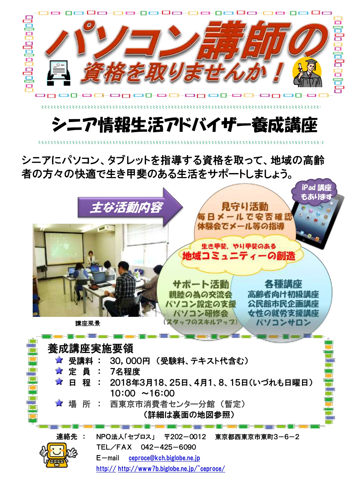 2018年2月14日 / 最終更新日時 : 2018年2月14日 yumecollabo シニア情報生活アドバイザー養成講座 開催日時 2018年03月18日(日曜日) 10:00〜16:00 会場 西東京市消費者センター 主催 NPO法人 西東京NPO推進センター[セプロス] 連絡先 042-425-6090 Facebook