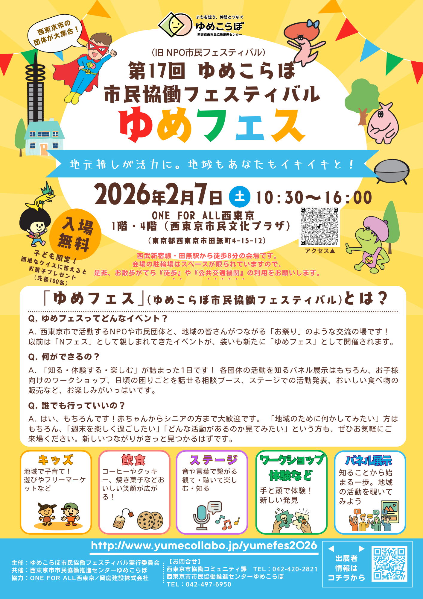A. 西東京市で活動するNPOや市民団体と、地域の皆さんがつながる「お祭り」のような交流の場です! 以前は「Nフェス」として親しまれてきたイベントが、装いも新たに「ゆめフェス」として開催されます。